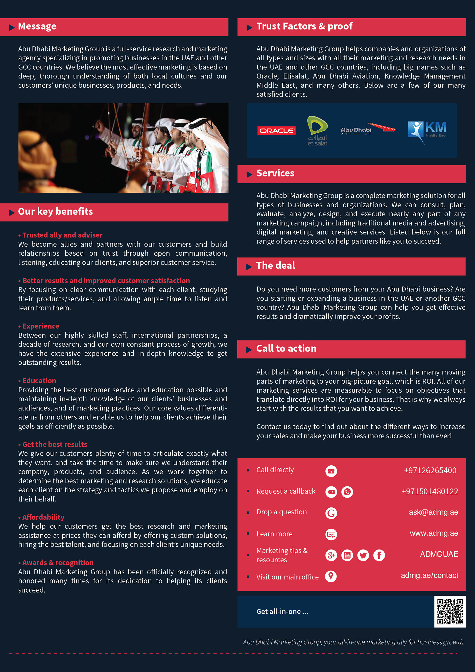 Abu Dhabi Marketing Group is a full-service research and marketing agency specializing in promoting businesses in the UAE and other GCC countries.